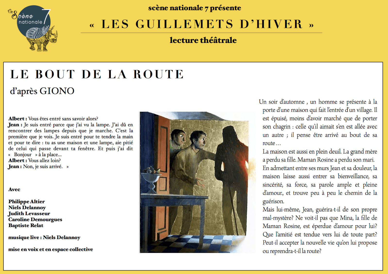 la compagnie scène Nationale 7 est venue présentée le spectacle “Le poète doit être un professeur d’espérance.” autour de Jean Giono. c’était le samedi 12 Janvier 2019… une merveilleuse soirée.
