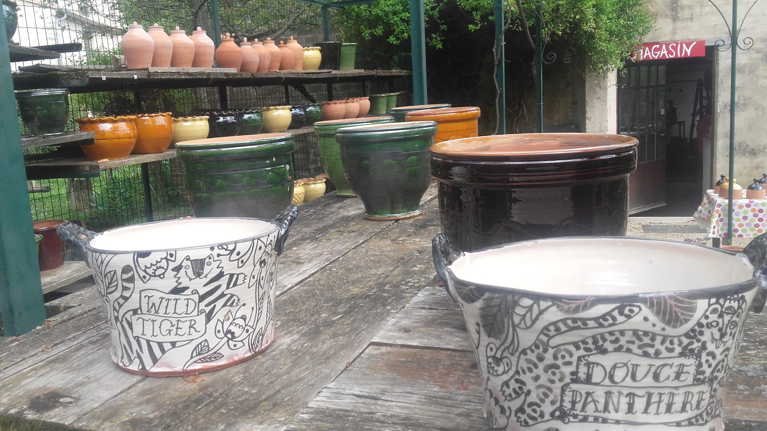 Les pots de Marie DELAFOSSE sur les planches de l’enclos.