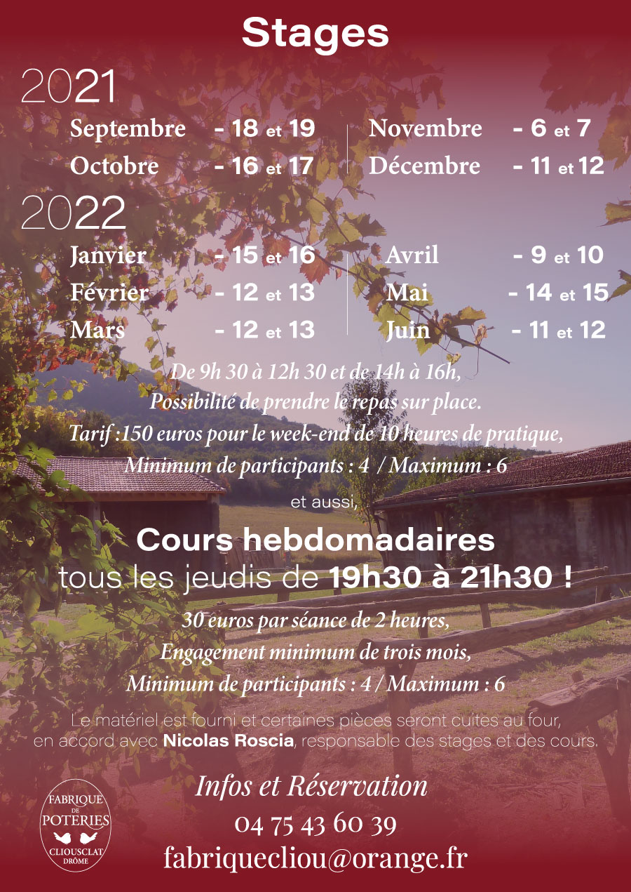 C’est sous la conduite de Nicolas ROSCIA que débutent ce soir les cours hebdomadaires, dans l’atelier relais loué à cet effet à la mairie de Cliousclat. 3 stagiaires sont inscrits et une place reste encore disponible ! Nicolas est motivé et heureux de “prendre en main et en terre” ces stagiaires !