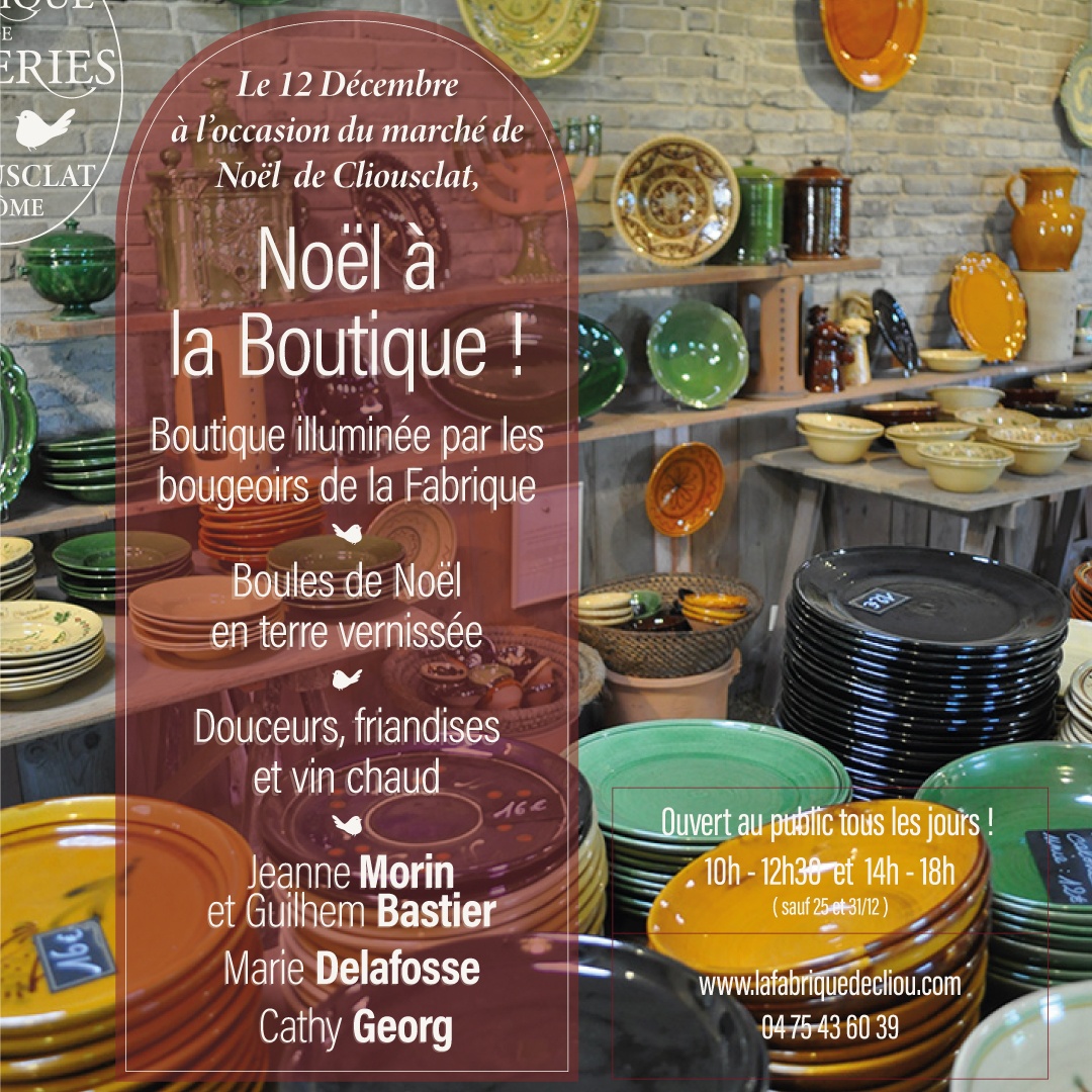 Dimanche 12 décembre, de 12 heures à 18 heures, les artisans seront installés sur la place au coeur du village et dans l’enceinte de la Fabrique. Boutique ouverte, avec la présentation des nouvelles pièces de poterie, boules de Noël et chandeliers sortis du four. Pour découvrir aussi les productions de Jeanne Morin et de Guilhem Bastier, de Marie Delafosse et de Cathy Georg.