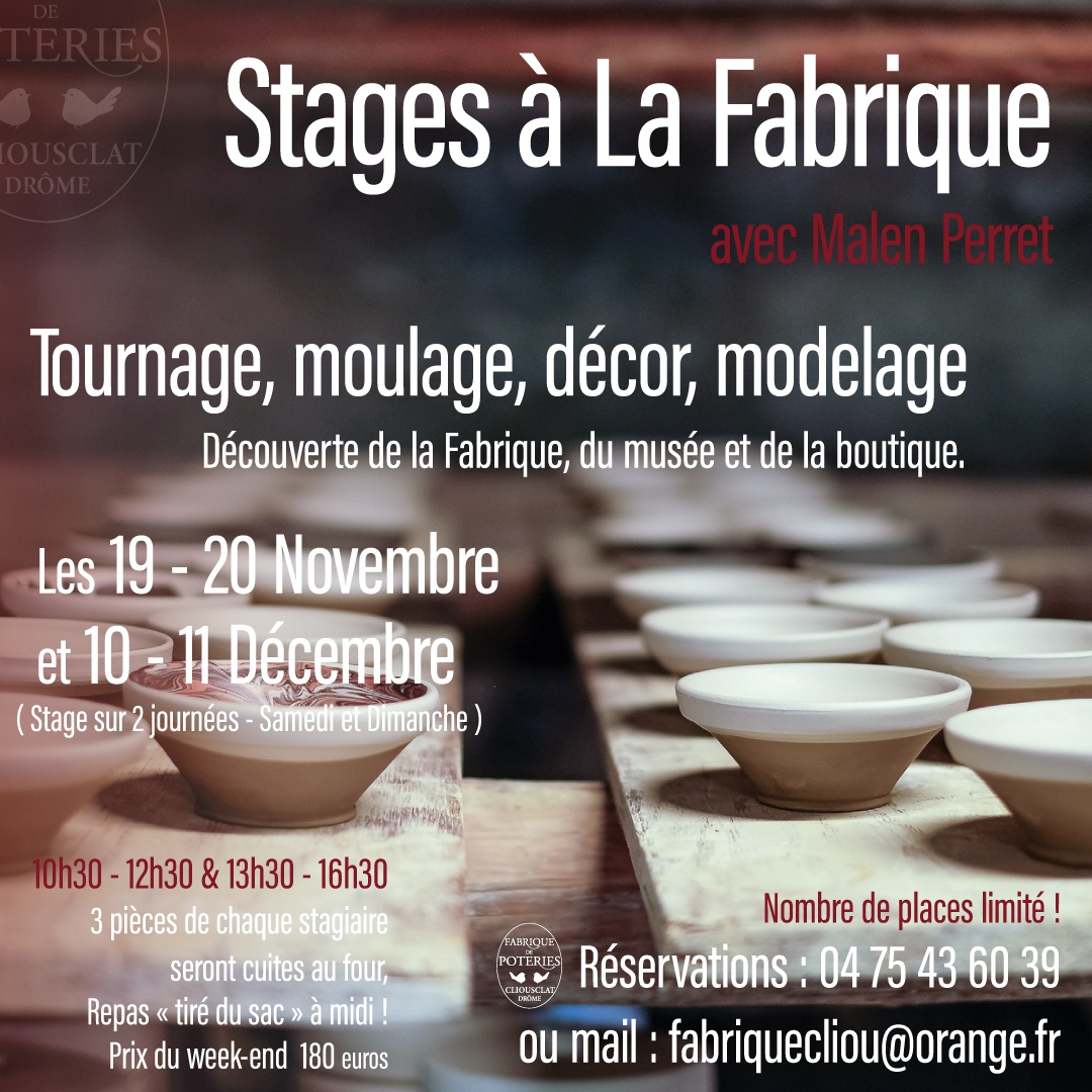 C’est Malen Perret, céramiste, qui cette année assurera les stages à la Fabrique, dans l’atelier centenaire. Deux jours par mois, jusqu’au mois de juin, les amateurs pourront profiter de son encadrement et de ses conseils. Travail avec la terre de Cliousclat, sur les tours Shimpo. Une expérience unique à vivre et à partager.