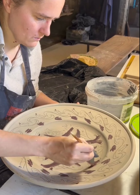 Dans cette seconde vidéo dédiée au plat aux poissons, Emily applique les couleurs : des jus d’oxydes et des engobes viennent enrichir le décor. La pièce sera ensuite cuite une première fois, émaillée, puis repassera au four pour sa cuisson finale.