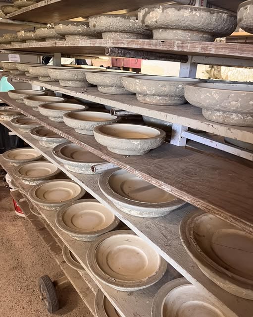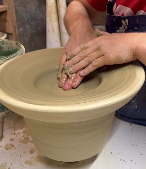 Dans une poterie artisanale comme celle de Cliousclat, la calibreuse est un outil essentiel pour façonner des assiettes régulières et harmonieuses. Elle fonctionne grâce à un gabarit métallique qui tourne au-dessus de la boule d’argile placée sur le tour. En quelques instants, l’excédent de terre est retiré et la forme de l’assiette apparaît avec une grande précision. Cette méthode allie rapidité et constance tout en préservant le geste artisanal du potier. Chaque pièce est ensuite séchée, émaillée et cuite, gardant le charme du fait main.