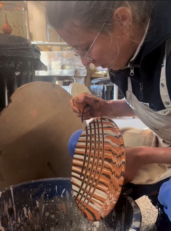 L’étape de la couleur sur ce décor au fait au clou. Ce saladier sera en boutique dans quelques semaines. Le décor au clou des poteries consiste à imprimer des motifs en enfonçant un clou, une pointe ou un petit outil métallique dans l’argile encore fraîche.Ces impressions répétées créent des points, cercles, rosaces ou trames géométriques, …