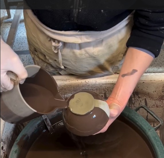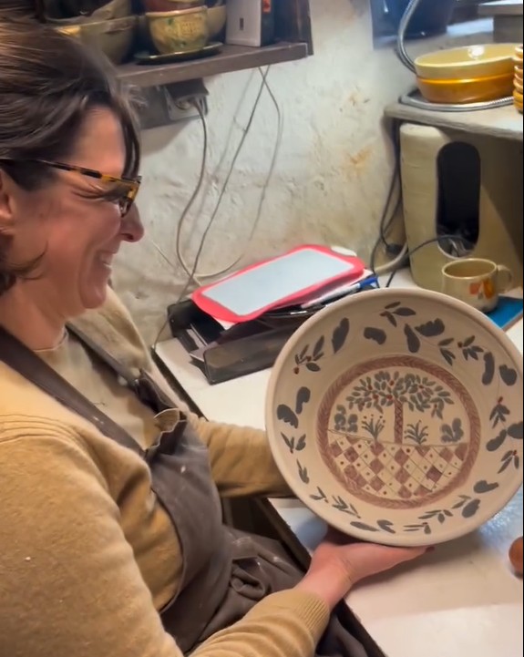L’étape de la couleur sur ce décor au fait au clou. Ce saladier sera en boutique dans quelques semaines. Le décor au clou des poteries consiste à imprimer des motifs en enfonçant un clou, une pointe ou un petit outil métallique dans l’argile encore fraîche.Ces impressions répétées créent des points, cercles, rosaces ou trames géométriques, …